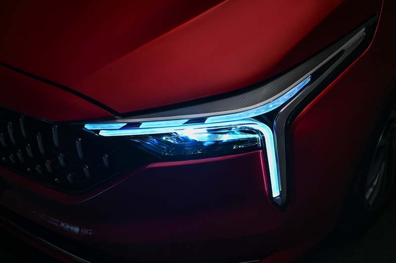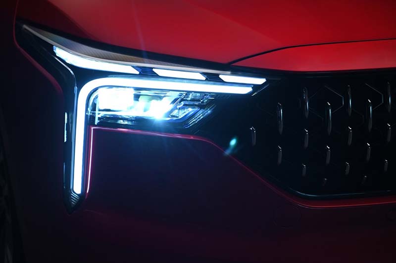 从官图中我们猜测,新车灯组采用了全LED灯源,并结合古代兵器“戈”的设计思想,弱化了大灯的瞳孔效应,在功能上与格栅的装饰性进行了融合。此外,示宽灯分为上下两部分,上半部分采用三段式设计,在末尾处随着机盖边缘向车后延伸;下半部分在转角处垂直向下,形成了一个90°角,酷似“戈”的利刃。